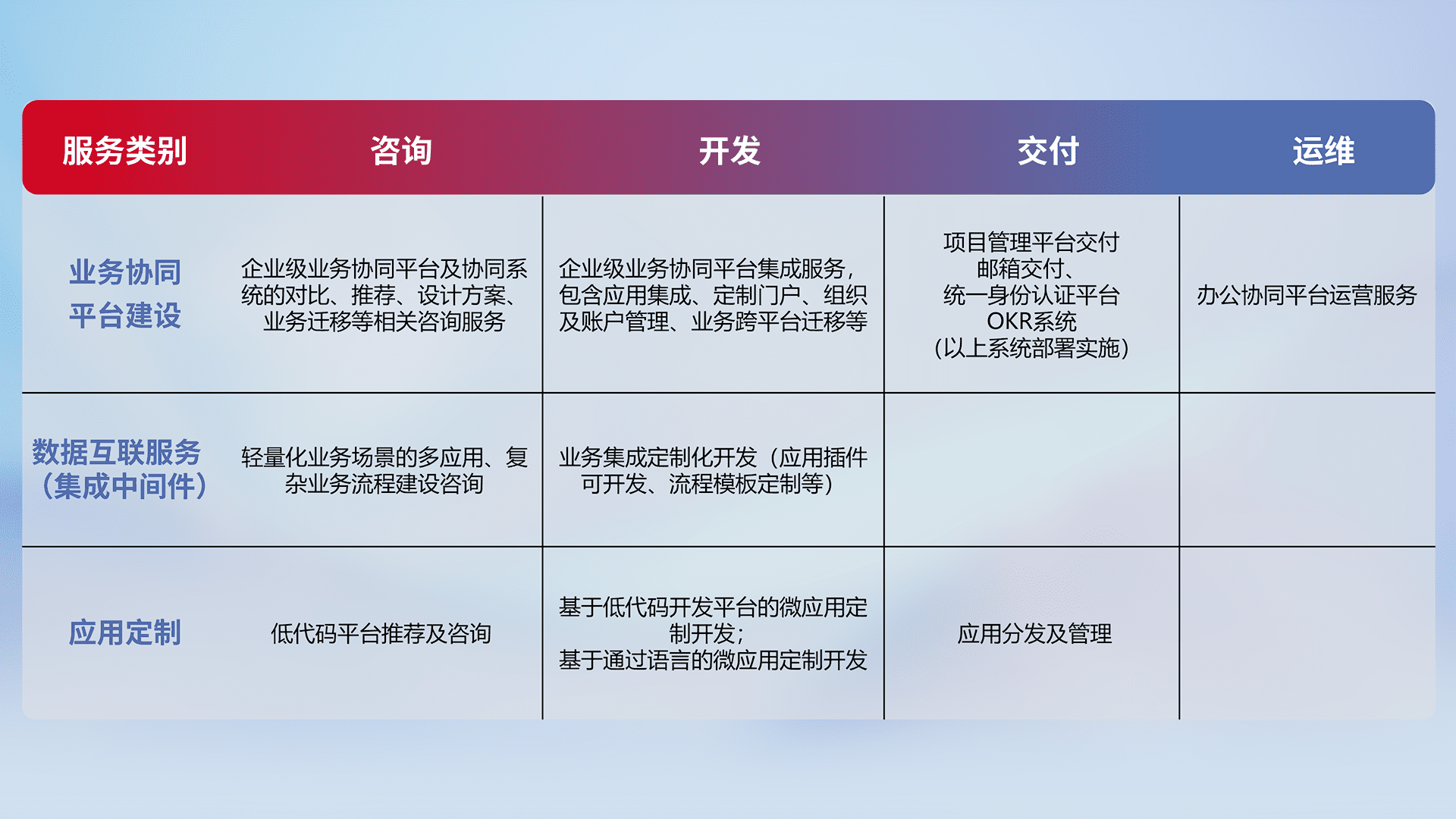 针对钉钉、、、、企微、、、、IDaas等平台级产品提供产品的规划、、、、方案、、、交付、、、、定制化开发等服务,,实现如统一协同办公、、、智能客户服务、、混合会议管理、、、智能数据查询、、、、等业务场景,,,实现数字化转型。。
